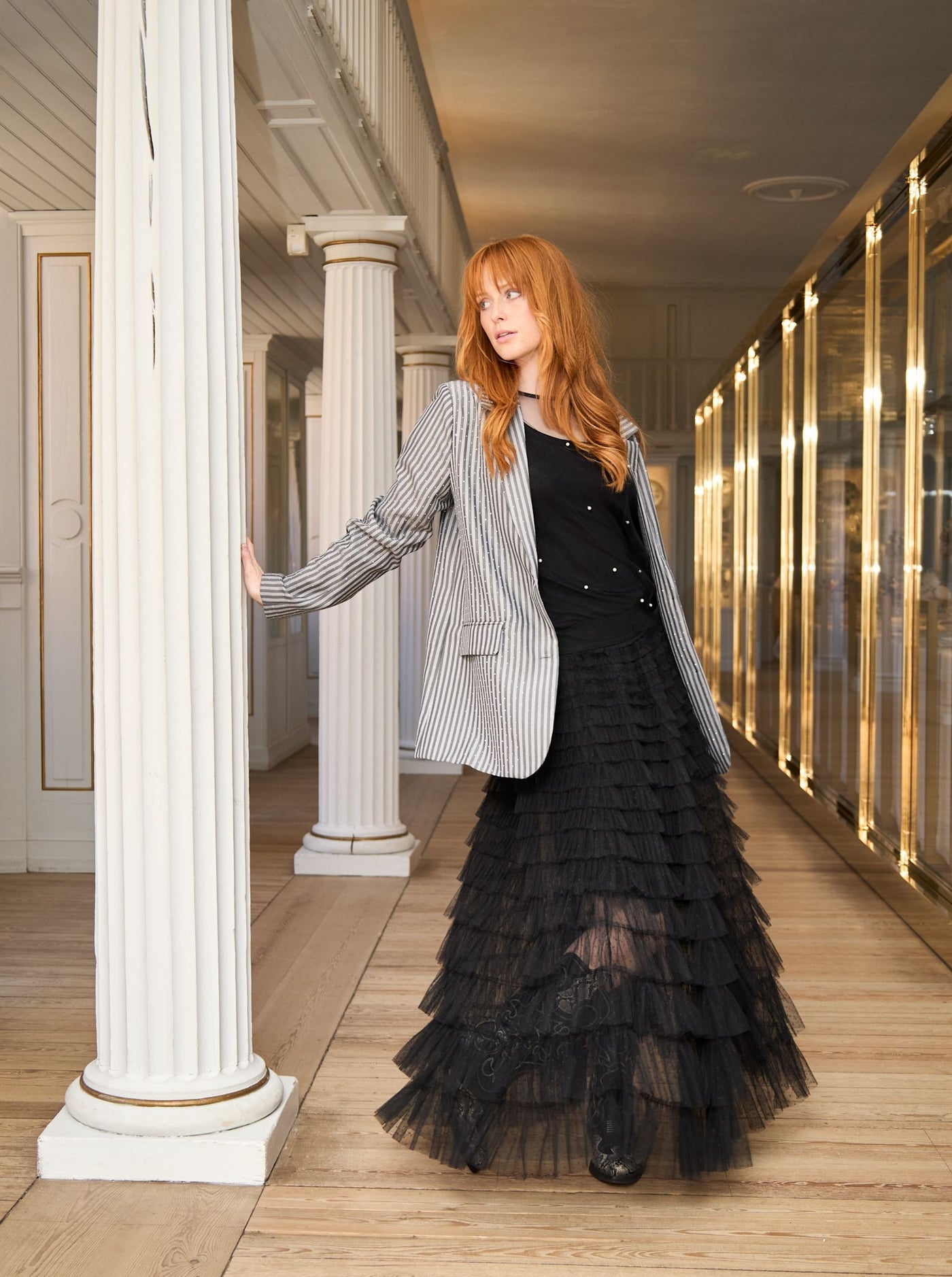 The Angelina skirt is a romantic and eye-catching skirt, designed in layered tulle with fine ruffle details that create lots of volume and movement. The wide, elastic waistband ensures a comfortable fit, while the transparent outer layer gives a feminine and modern look.