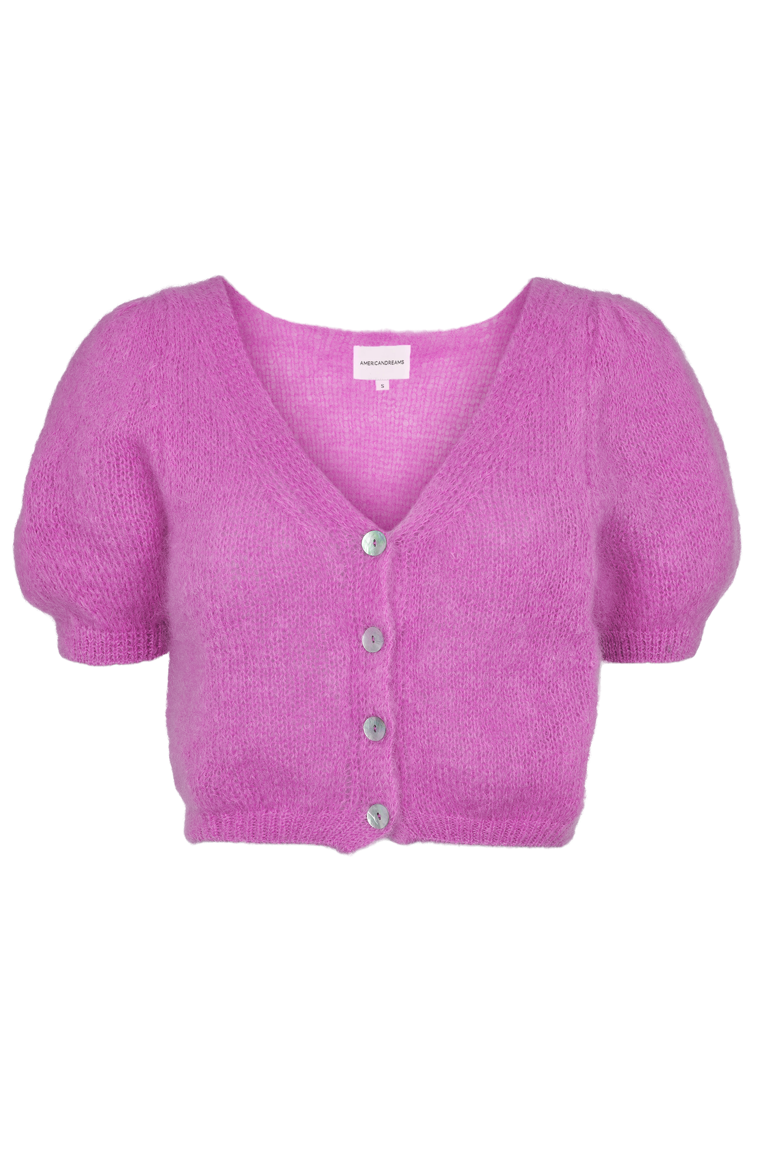 A cropped knitted cardigan featuring a button closure and V-neck that accentuates the delicate lines of the neck and collarbones will add a feminine touch to your daily ensembles. The cardigan is inspired by our signature Cornelia cardigan made in a short sleeve version especially suitable for spring and summer.