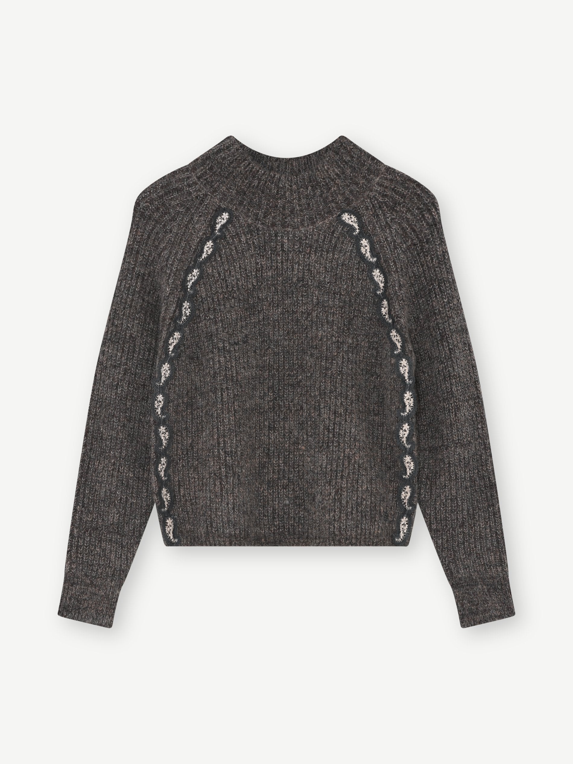 Beautiful and light jumper with a fabulous detail of metallic paisleys all the way down from the collar to the waist.. A really lux piece from Gustav.