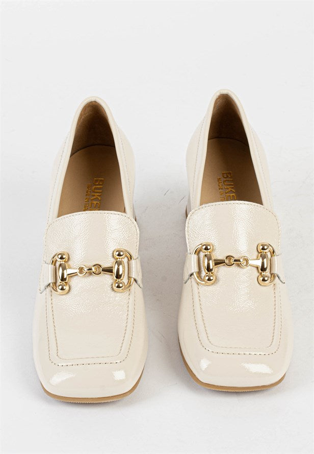 Classic and elegant pump from BUKELA, with lovely details. It comes in a nice Black or Latte (Creme) patent with a gold buckle across the instep.