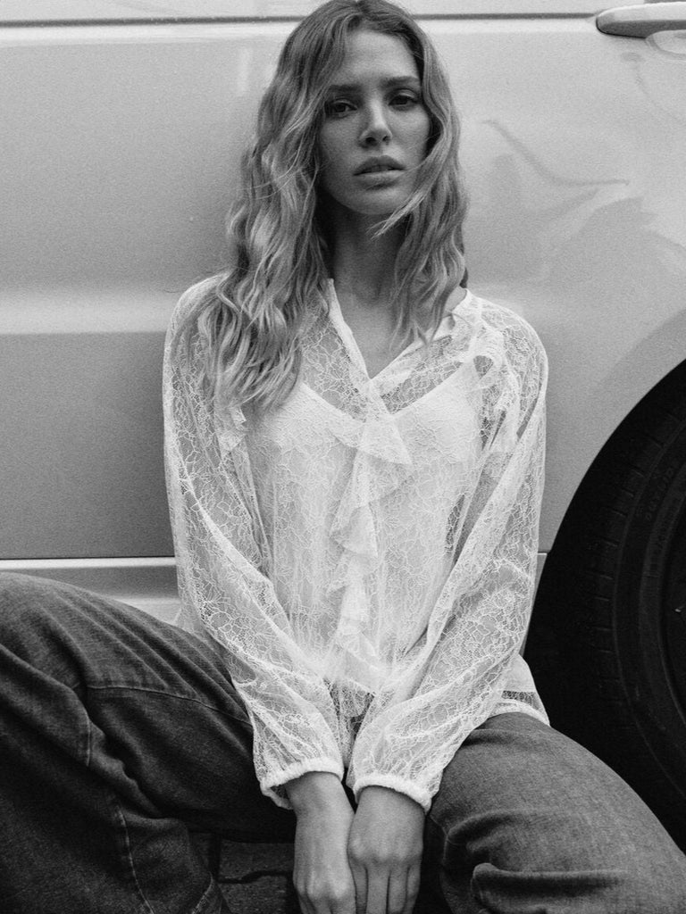 This beautifully feminine blouse is crafted in a relaxed fit, showcasing an intricate see-through lace pattern for a refined and elegant look. Designed with delicate frill details and a matching singlet underneath, it perfectly balances sophistication and coverage. Style it with tailored trousers for an elevated ensemble or pair it with jeans for a stylish contrast.