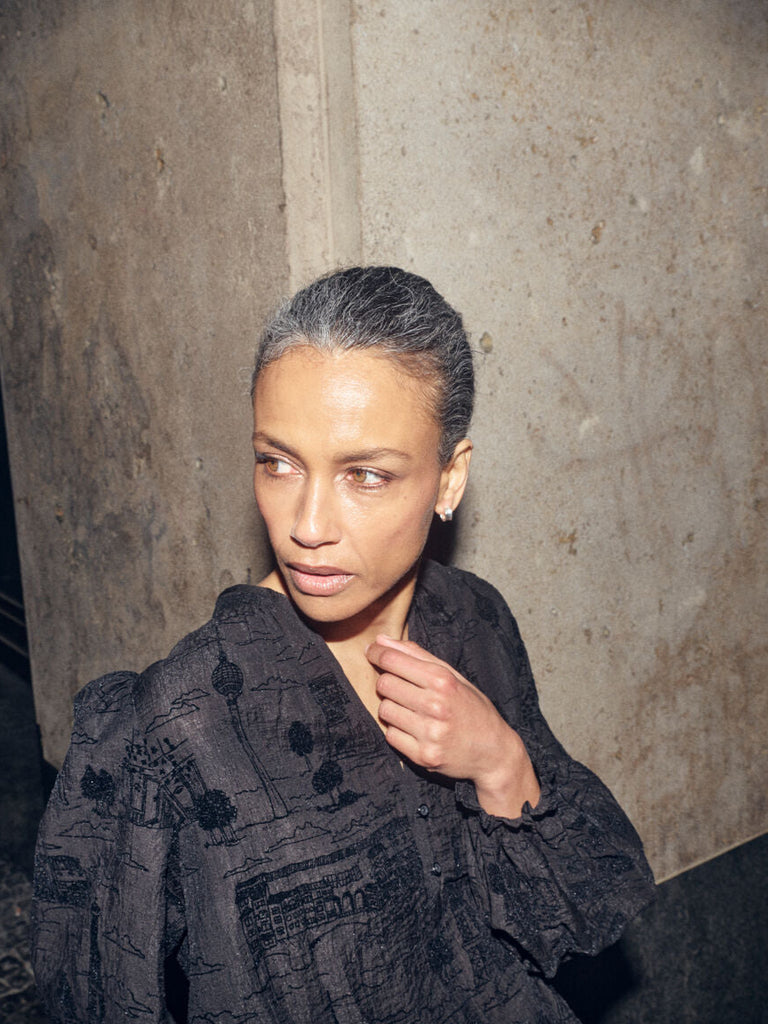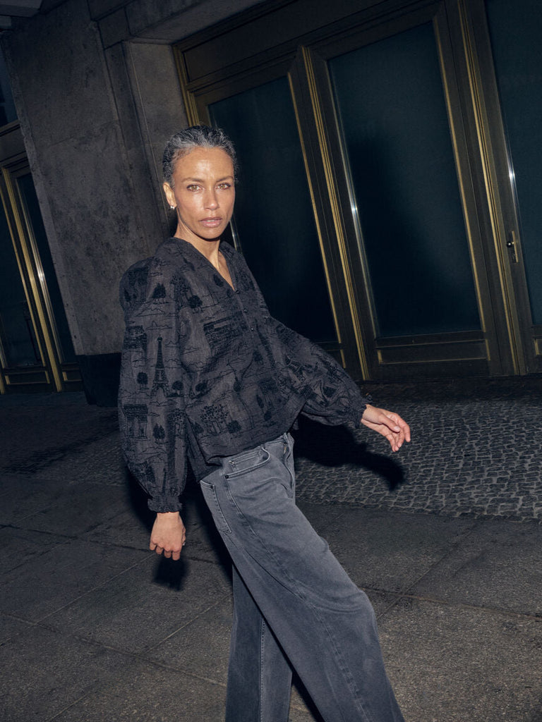 This effortlessly chic blouse is designed in a relaxed silhouette, featuring a unique hand-drawn pattern showcasing iconic attractions from around the world.